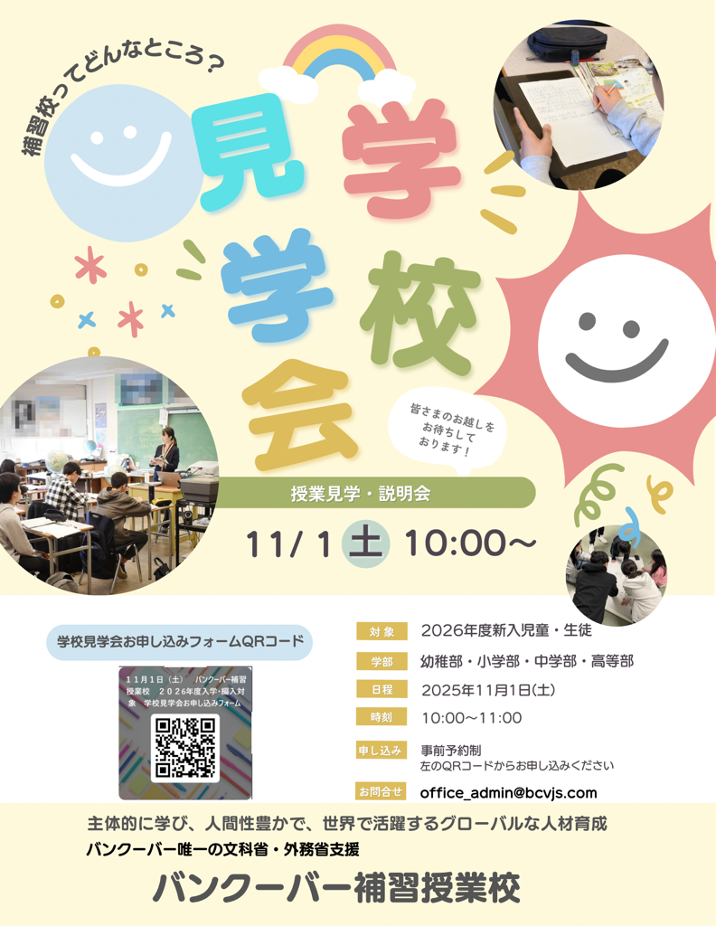 11月1日(土)午前10時から11時迄、令和8年度(2026年度)4月からの新入学・編入学を検討中のご家庭に向けた学校見学会を開催いたします。